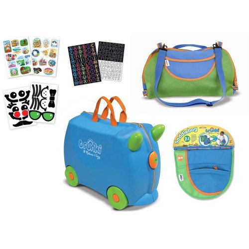 Terrance Trunki Travel Bundle ... Set includes Trunki, saddlebag, tote bag, fun face stickers, destination stickers, and alphabet stickers