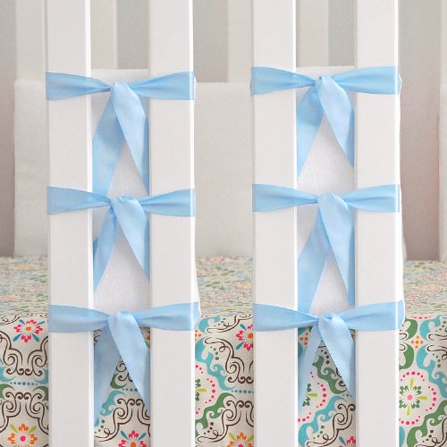 The Ventilated Slat Bumper with Satin Light Blue ties is the perfect solution to the bumper controversy. This patent-pending slat bumper from Oliver B offers 20 individual pads that are attached to your crib with three secure ties. These slat bumpers are made out of white minky fabric and give your crib the aesthetic look of a bumper, while still allowing maximum air circulation in the crib.