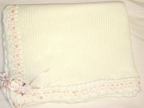 ... by 45" Blanket Trimmed by Hand Crochet with White ... Trimmed with Pink Ribbons. Knitted White Cotton Finished Hand Crochet with White Chenille Girls Blanket ...