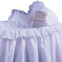 What A Fresh StartStark white eyelet set is ornamented with small buds sparingly scattered. A frilly short ruffle with a satin bow keeps it simple, tasteful, and beautiful.Complement your set with a coordinating pillow and blanket. A bassinet to cherish, from generation to generation.