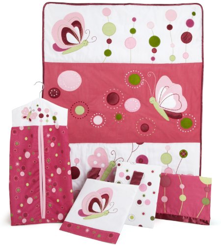 A fun contemporary design of dots, circles, swirls and butterflies in raspberry, cherry, plum and lime. Soft suede fabrics, shiny satin embroidery, velours and fine wale corduroy coordinate together in this stylish collection. Our unique butterfly lamp with its fantasy foliage and dotted shade will light up the nursery. The 5-piece silhouette butterfly wall décor along with the wall appliqués of dots, circles and butterflies is a great way to complete baby’s room. Additional accessories include a baby soft plush blanket, appliquéd diaper stacker, window valance and slip cover chair. Also available in toddler bedding, mini crib set(port-a-crib) and twin bedding.
